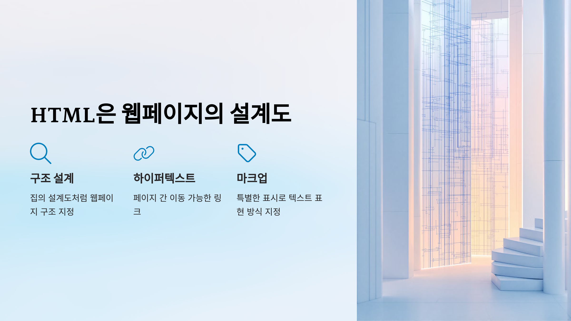 쉬운 비유: HTML은 집을 짓는 설계도와 같아요. 집의 방이 어디에 있고, 문과 창문은 어디에 배치할지 알려주는 설계도처럼, HTML은 웹페이지의 구조를 알려주는 언어예요.