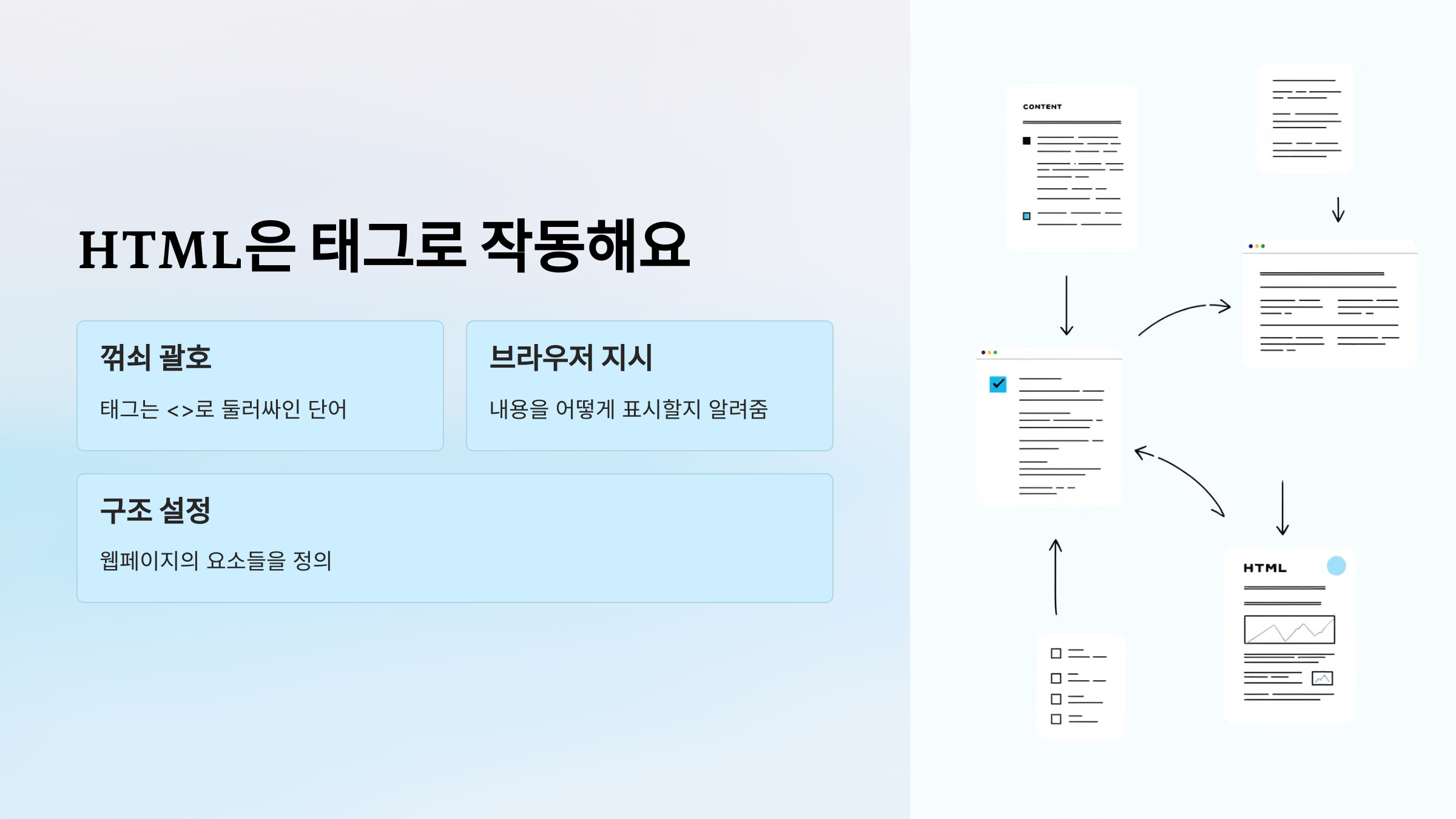 HTML은 태그(Tag)라는 것을 사용합니다. 태그는 꺾쇠 괄호(<>)로 둘러싸인 단어나 문자로, 웹 브라우저에게 내용을 어떻게 표시할지 지시합니다.