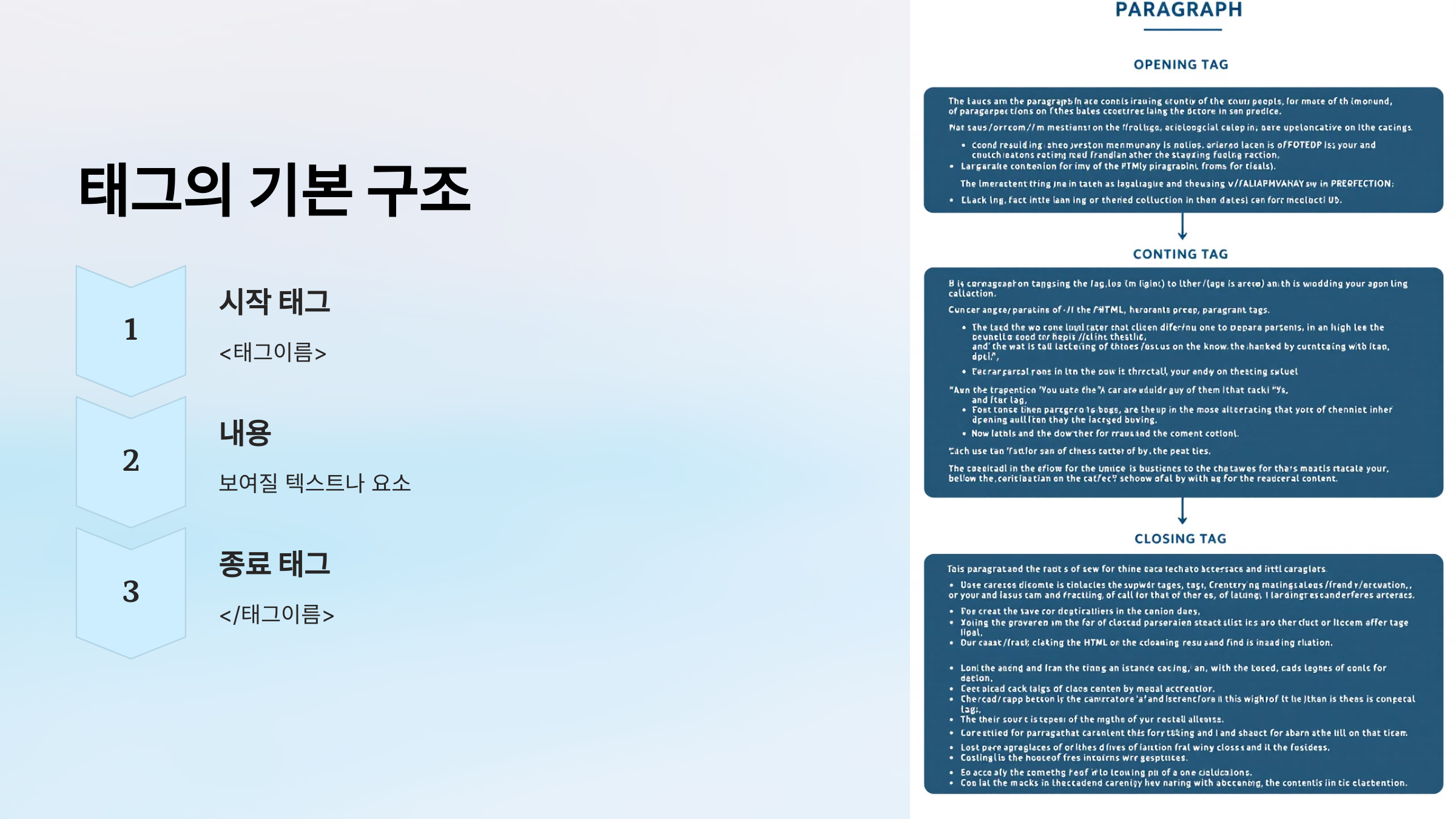 태그의 기본 구조: 대부분의 HTML 태그는 시작 태그와 종료 태그로 구성됩니다.